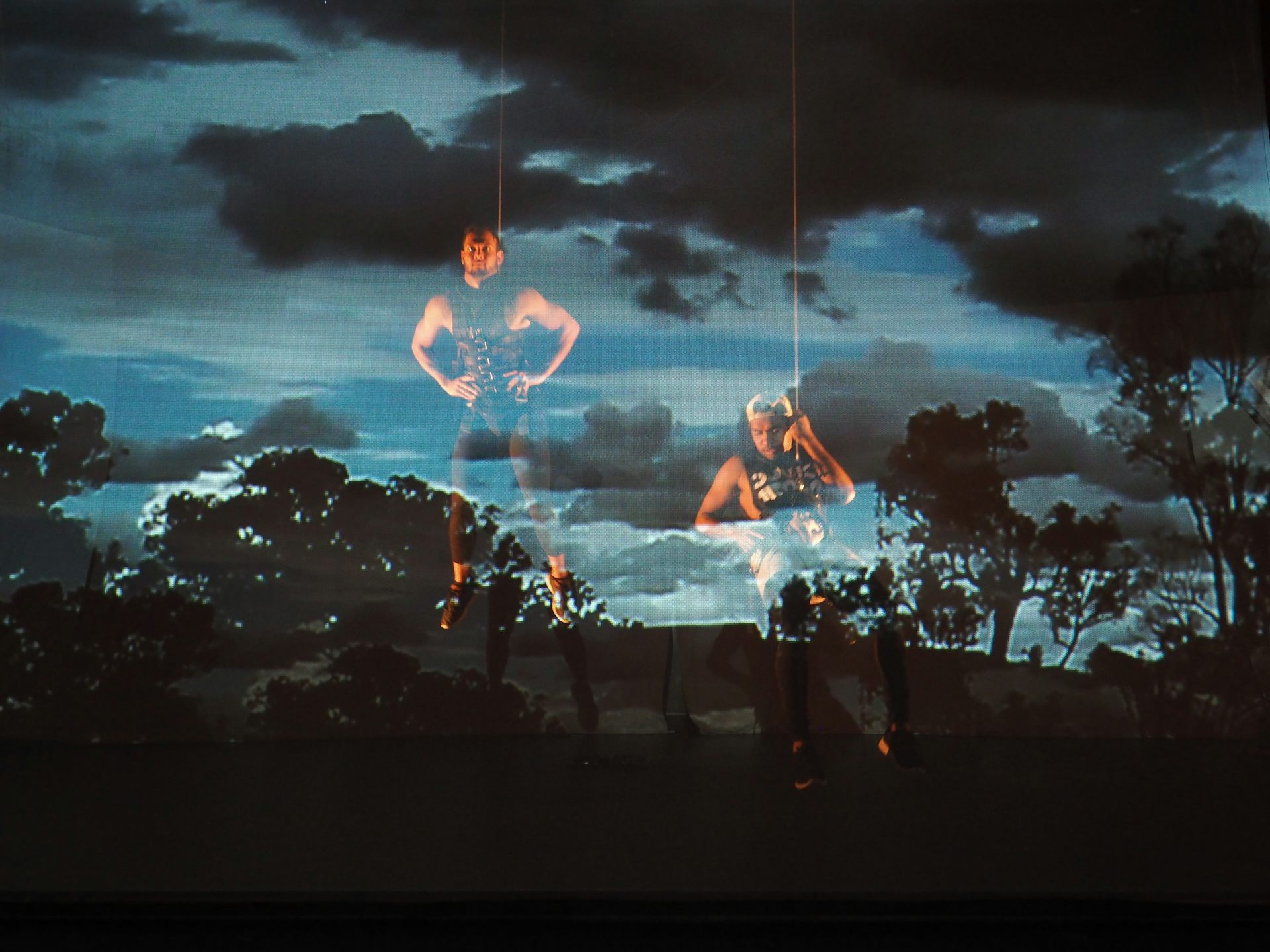 Yovich’s moving monologue about giving birth to twins Bear and Evelyn is breathtakingly amplified by an aerial ballet performed by Kyle Shilling and Caleena Sansbury. The iconic Australian Hill’s Hoist is used throughout the work as a type of aerial trapeze; first as Bear relives the horror of his own father’s suicide and later as Ash spins into a cyclonic whirl in the wake of Bear’s suicide.
