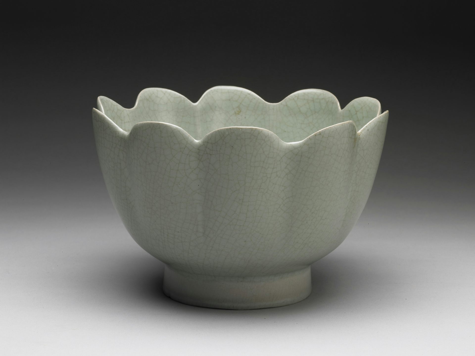 Northern Song, late 1000s–early 1100s Song dynasty 960–1279 ‘Celadon warming bowl in shape of a lotus blossom’ porcelain, ru ware, 10.4 x 16.2 cm (rim diam) National Palace Museum, Taipei. Photo: © National Palace Museum, Taipei