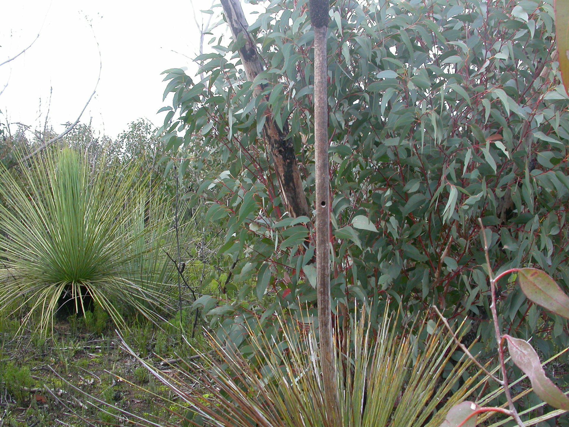 The bees mainly dig their nests in two types of soft wood: dry flowering stalks of grass trees and, crucially important, large dead Banksia trunks. The availability of both nesting materials is intricately connected with fire.
