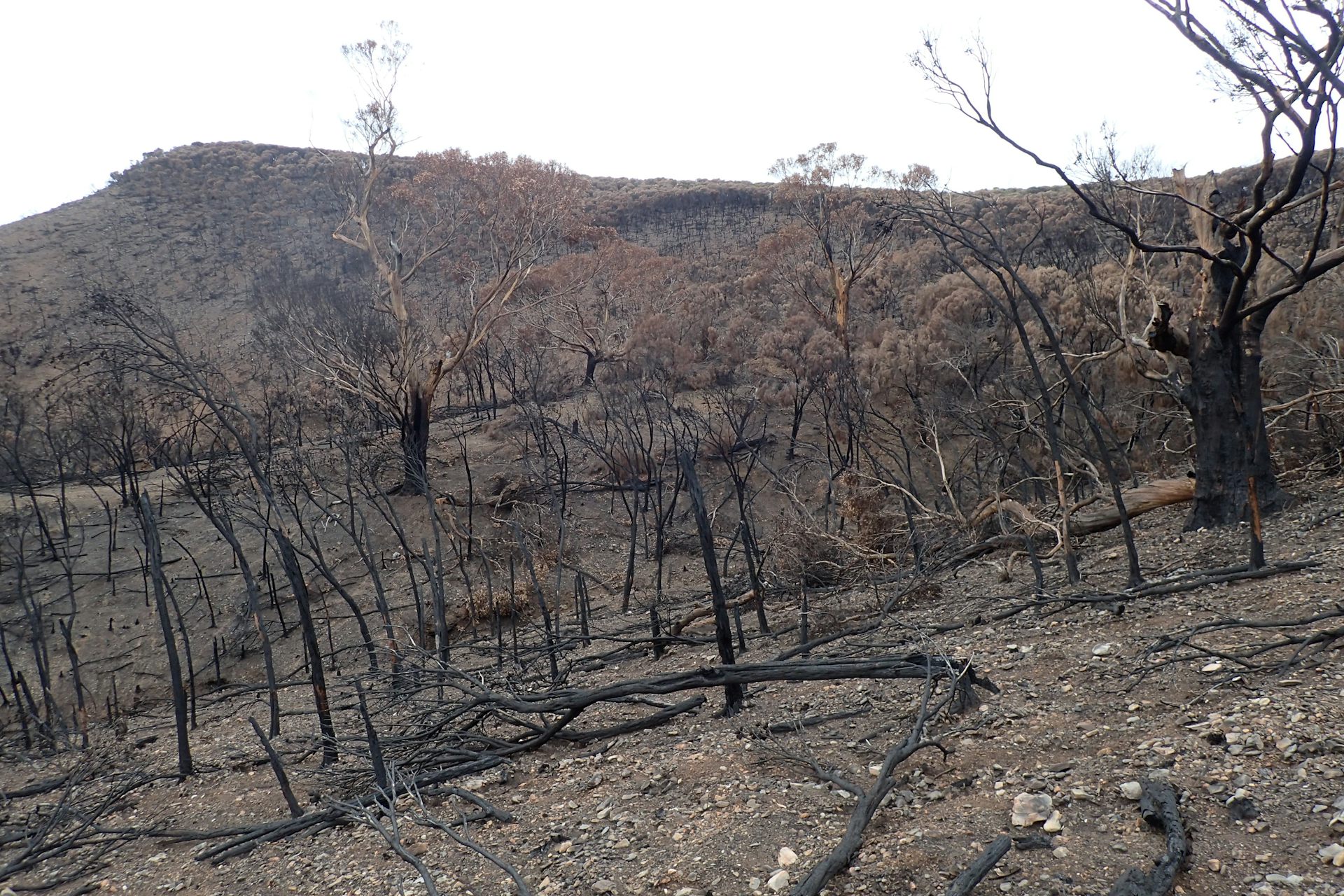 I’m standing on a hill in Kangaroo Island’s Western River Wilderness Protection Area, looking over steep gullies and sweeping hillsides. As far as I can see, the landscape is burnt: bright patches of regrowth contrast with skeletal, blackened trunks. It’s stark, yet strangely beautiful.