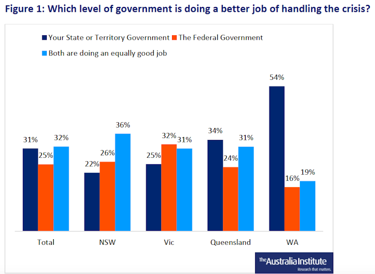 Polling from the Australia Institute, a progressive think tank, done late last week found when people were asked which level of government was doing a better job handling the COVID crisis, 31% thought their state or territory government, compared to 25% who said the federal government, and 32% who thought both governments were doing an equally good job. Some 13% said they didn’t know or were not sure.