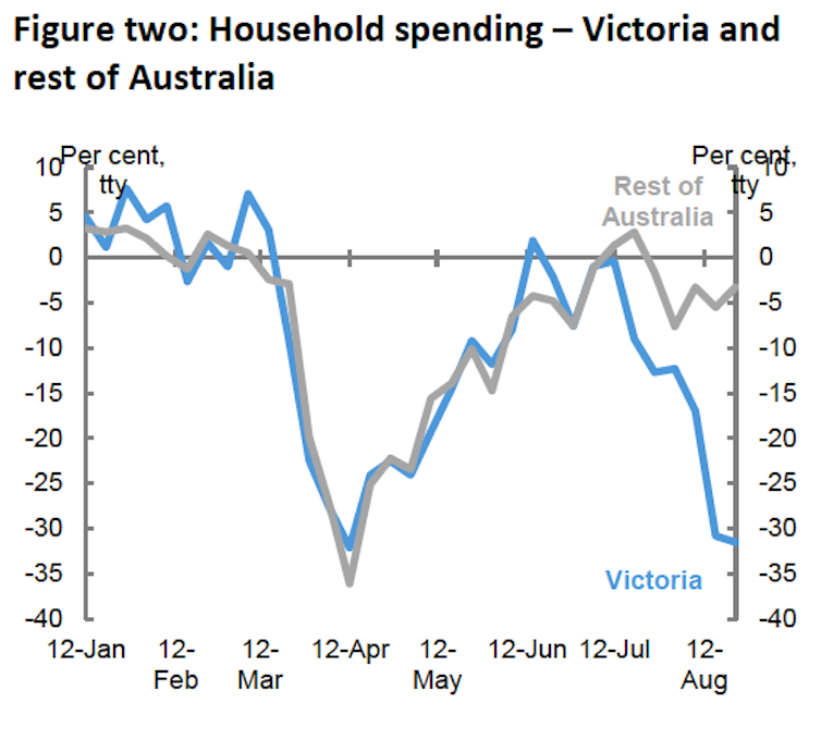 According to Treasury’s analysis of the Commonwealth Bank data, since the Victorian lockdown was reimposed, there has been a large fall in Victorian household spending growth relative to elsewhere.