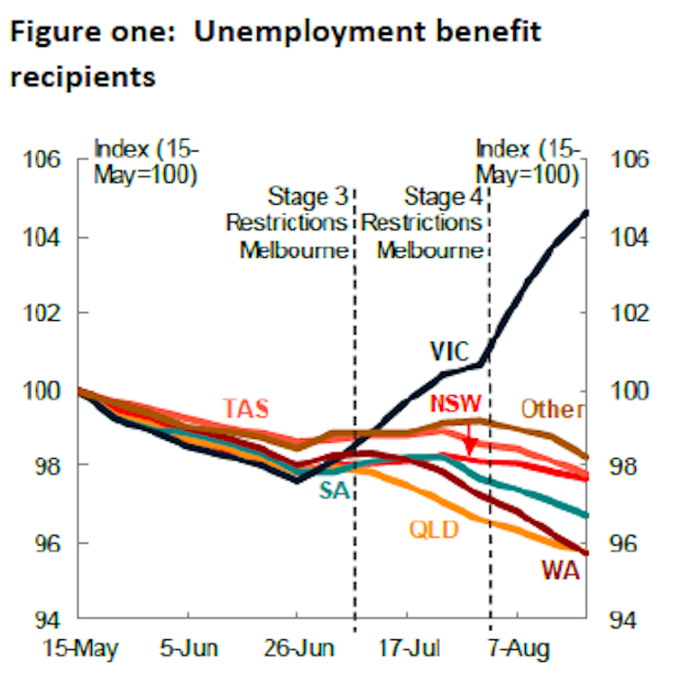 Since late June Victorians on unemployment benefits rose by 27.600 (7.2%). More than half the increase was in the three weeks to August 21, when the stage 4 lockdown was operating.