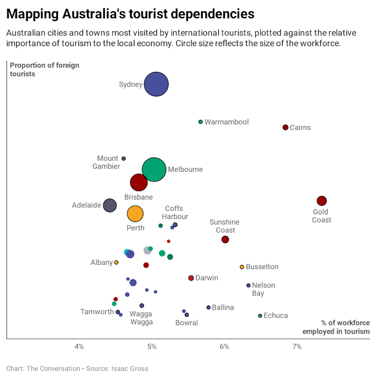 At a glance, Cairns, the gateway to the Great Barrier Reef, stands out as the having the most to lose, due the relative importance of tourism, and international tourists, to its economy.