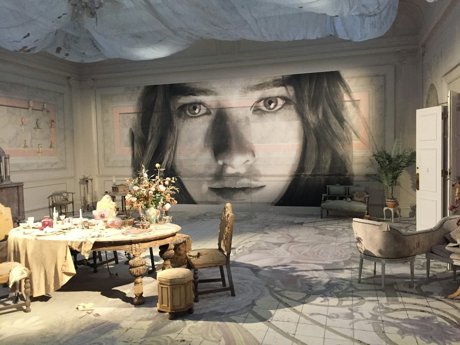 It is styled in decaying vintage opulence, like an ethereal moment in time. There are murals painted directly onto the walls of the gallery but the majority of the exhibition features studio works on varied surfaces, under framed glass: early stencils on canvas, portraits on poster advertising (styled to look torn and weathered) and poster-sized photographs of murals in abandoned, dilapidated buildings.