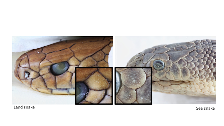 Most snakes have a dusting of thousands of touch receptors that look like freckles all over their face. These touch receptors are much larger in sea snakes, potentially so they can sense vibrations made by swimming prey and predators.