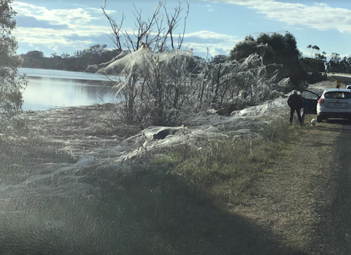This mass evacuation of spiders, and associated blankets of silk, is not a localised thing. It is seen in other parts of Australia and around the world after flooding.