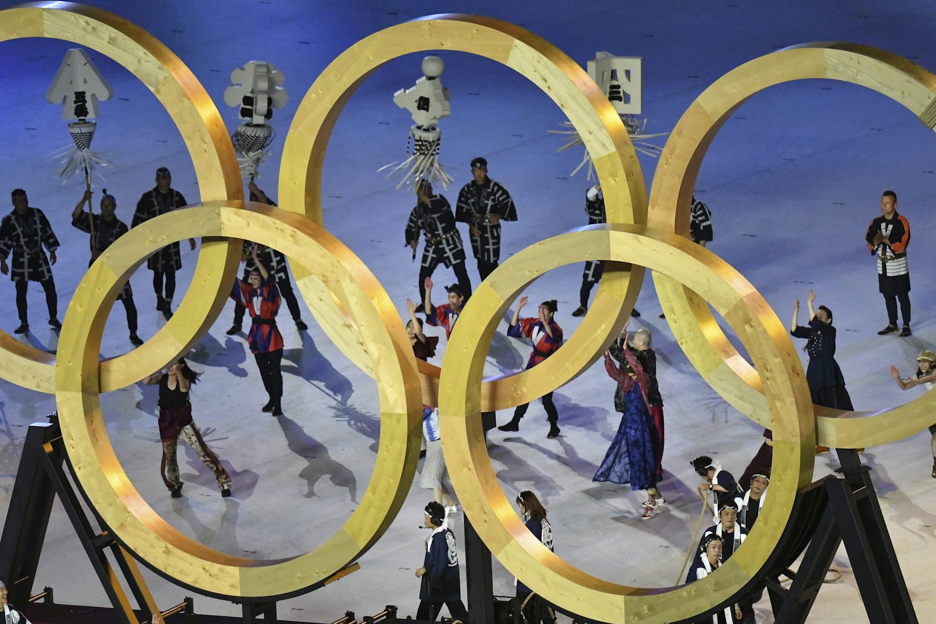 Beginning with the requisite video collage tracing the journey of the torch from Greece, we watch it enter the stadium and hand over person to person to the sounds of Ravel’s Bolero. There’s a moment’s respite from the slick technology and choreography when it lands with Japanese baseball legend and octogenarian Sadaharu Oh.