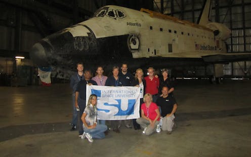 Me (top, third from right) with others from the International Space University, in front of the Shuttle Atlantis at NASA’s Kennedy Space Center. Author provided