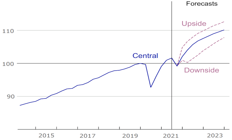 Taken together with last year’s descent into recession and quick bounce back it paints a picture of a W-shaped recovery, even on what the Bank has graphed as its “downside” scenario.