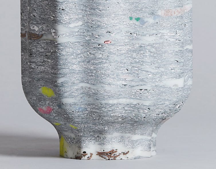 We drew attention to these hidden issues in the design of our “metalloplastiglomerate” vases. They were made by crumpling and hammering aluminium sheet around organic fibre, plastic and soft metal waste.