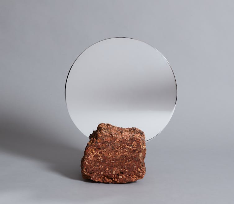 We considered this idea in the design of our aluminium and bauxite mirrors. They contain roughly the amount of aluminium able to be produced from the bauxite rocks that hold them. To communicate a sense of conservation, we modified the rock as little as possible. We made one cut to expose its beautiful pebble-like internal structure, and a second to hold the mirror.