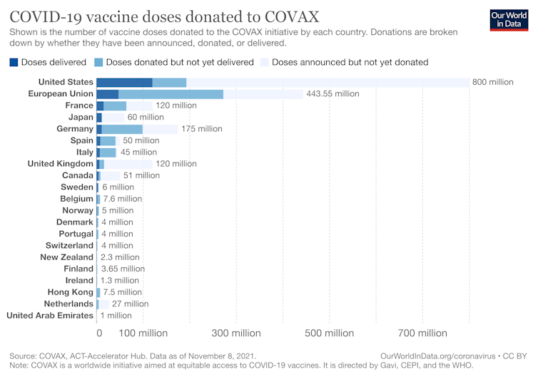 Take Australia as one example. It has pledged 60 million doses for developing countries in the Indo-Pacific region, but so far, less than 9.3 million have been delivered. None of these doses are slated for equitable distribution through COVAX, however, and none are currently committed for Africa.