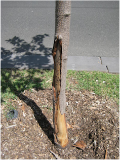 It’s usually a problem for trees with smooth and thin bark, such as several fruit tree species (stone fruits like apricot, plum and peach), birches, plane trees and some eucalypts. Trees with thick, fibrous or rough bark, such as oaks, elms, conifers and thick, rough barked eucalypts are usually insulated and protected.