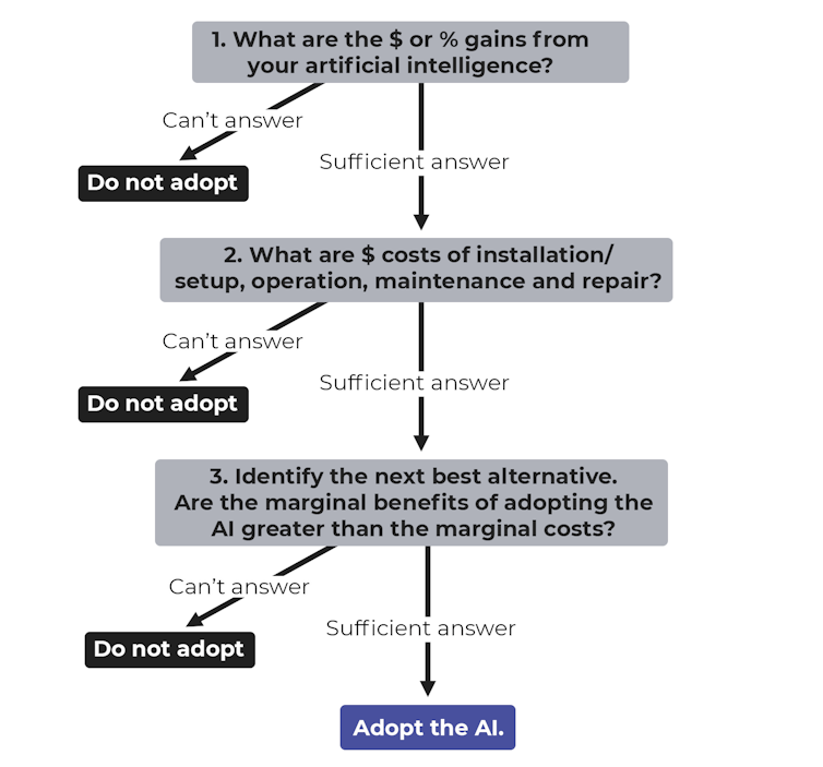 But the business case failed on the third question. The best-case marginal benefit of adopting the AI (saving $80,000 a year) was just equal to the marginal cost ($80,000 a year) – not counting the initial installation.