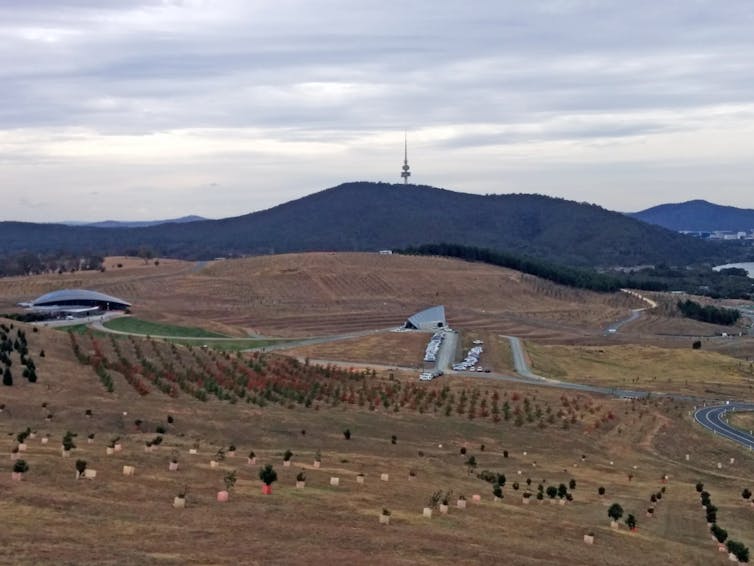 Trees being planted on a cleared hillside in Canberra, Australia.