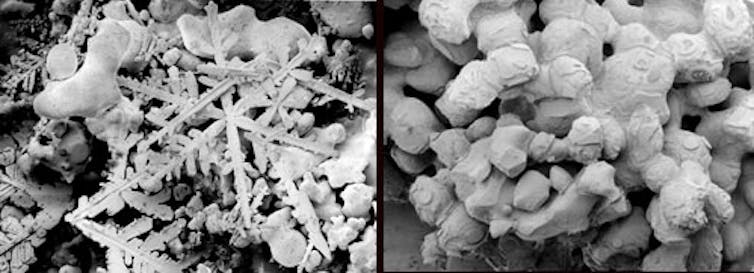 The snow that forms in this process isn’t quite the same as real snow, because artificial snow forms quickly from liquid droplets, instead of slowly from water vapour. As a result, the shape of artificial snow particles is different to that in natural snow. The former has no beautiful single-crystal structures, only tiny (polycrystalline) snowballs.