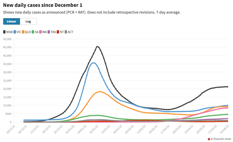 New South Wales is recording around 21,000 cases a day, the highest number in two months, while Victoria has around 10,000 a day.