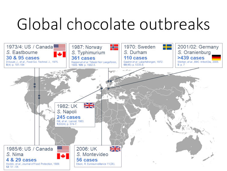 While reports of salmonella bacteria in chocolate are not common, there have been several high-profile outbreaks. Most documented cases of salmonellosis have been in Europe and North America, perhaps because chocolate consumption is high and monitoring and surveillance is in place.