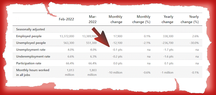The Bureau of Statistics confirms this by saying on its website that the unemployment rate fell by 0.1 percentage points between February and March while also (apparently inconsistentlly) saying it was 4.0% in both months.