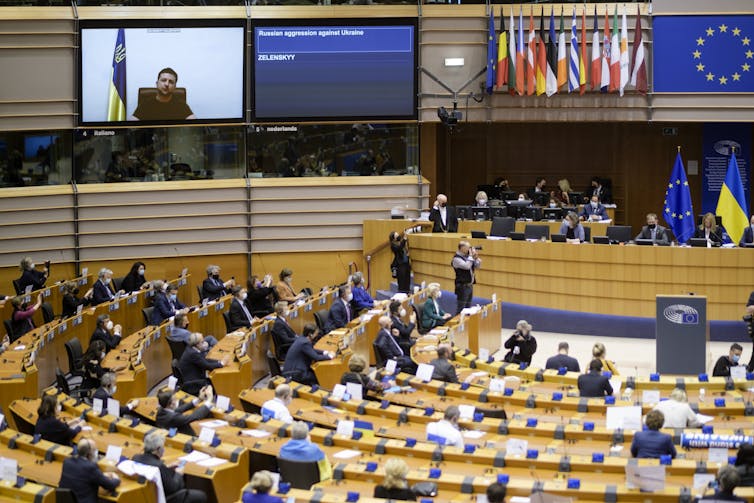Symbolic acts: Ukrainian president Volodymyr Zelenskyy addresses the Assembly of the European Parliament on March 1 2022.