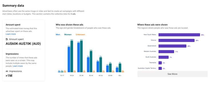 Meta’s ad transparency dashboard shows information about ad spending and targeting.