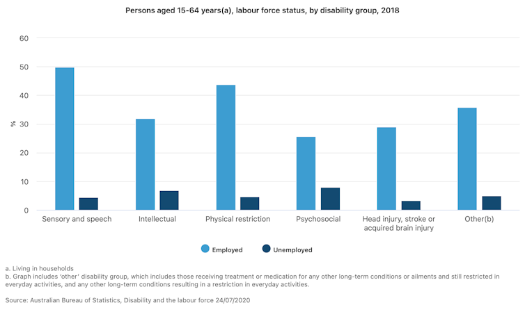 Even so, data released in 2020 (the latest available) show just 53.4% of people with disability are in the labour force, compared with 84.1% of people without disability.