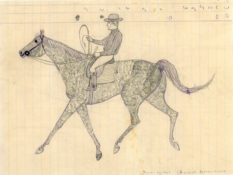 Tracker Nat, drawing of stockman on a horse, collected by Annie Lock at Barrow Creek, c1932.