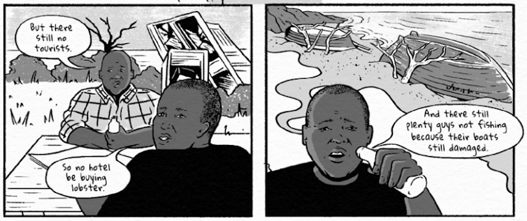 The characters in the comics are fictionalised but their stories are based on research – via interviews and surveys – the comic authors did about people’s experiences of climate change in Bolivia, Puerto Rico, Barbuda, South Africa and Bangladesh.