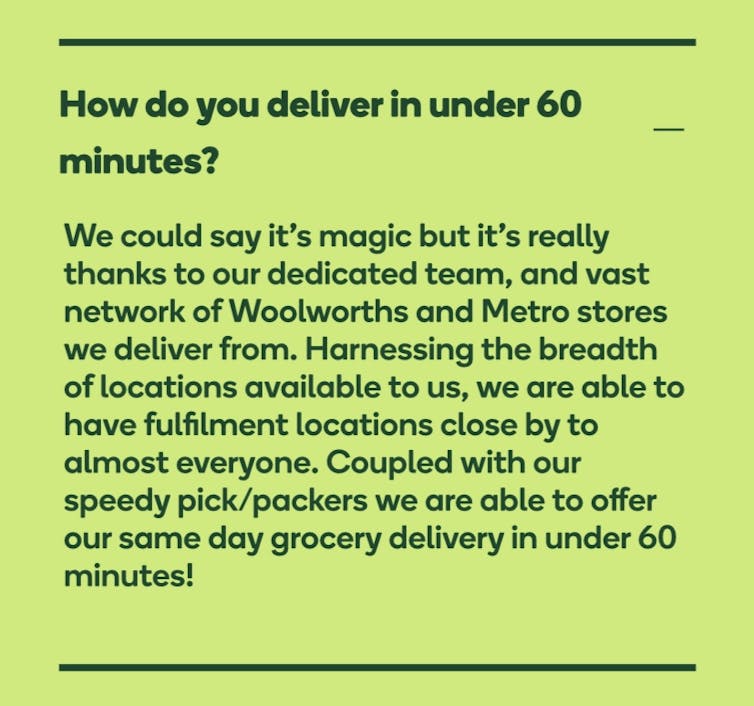 Woolworths and Coles Express have been offering on-demand deliveries through UberEats and Doordash since last year. Woolworths recently launched the Metro60 app which promises home delivery within an hour to select suburbs.