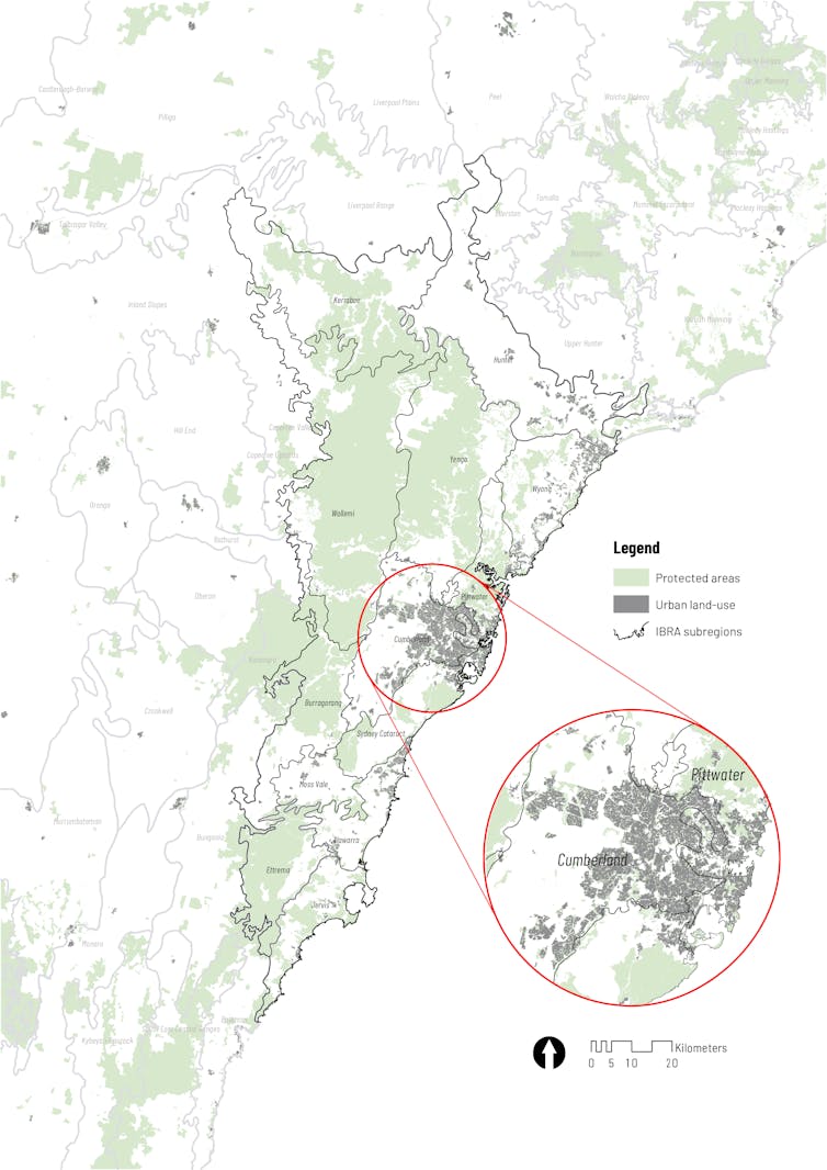 However, at the level of its subregions, the picture is different. Pittwater (31.62%), Yengo (58.55%) and Woollemi (71.81%) have high levels of protection. But look at how little land is protected in the subregions that sit entirely within Sydney proper – only 3.13% for Cumberland.
