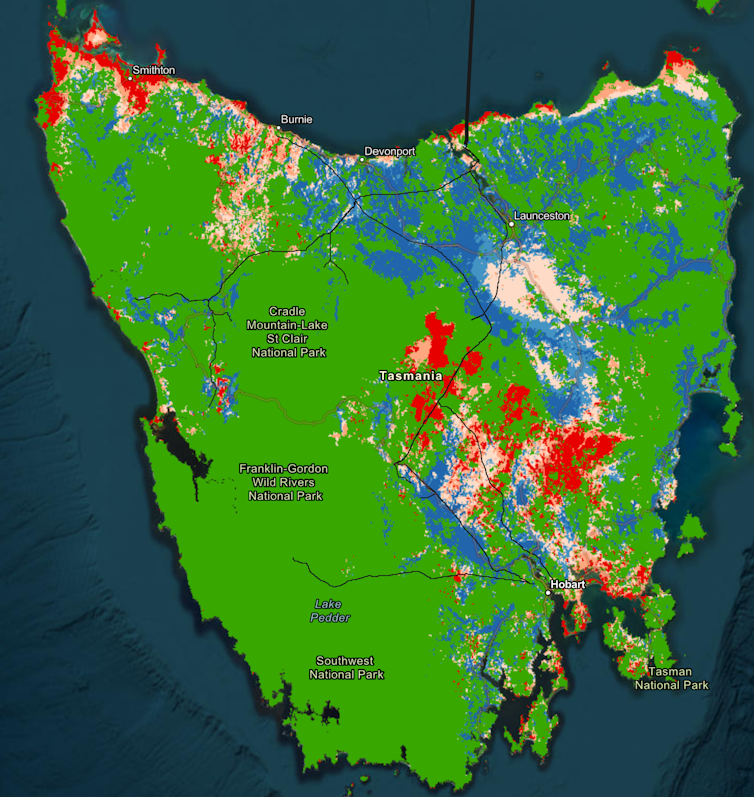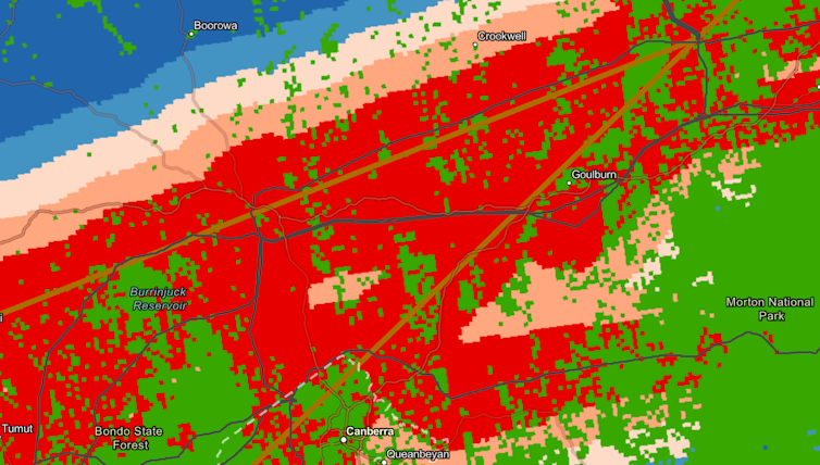 Pixels in the map are red if a location scores well. Yellow and blue pixels indicate less preferred locations. Green pixels are unsuitable land such as conservation reserves, urban regions and native forests.