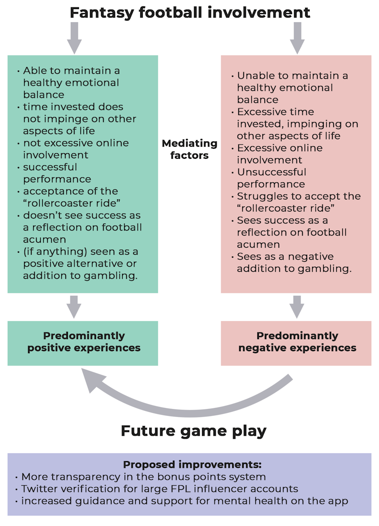 We also teased out some negatives. Responses from all participants lent support to our original study which highlighted fantasy football’s potential harm to wellbeing. “Anxiety-provoking”, “frustrating”, “addictive”, “affects self-confidence” and “disappointment and regret” were prevalent enough to warrant sub-themes of their own within the analysis.