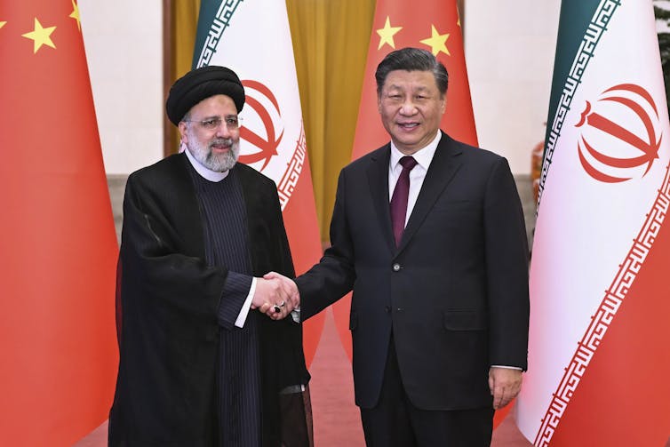 Iranian President Ebrahim Raisi, left, shakes hands with Chinese President Xi Jinping before their meeting at the Great Hall of the People in Beijing last month.