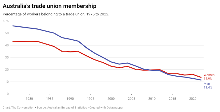 The implications of all this for other workers are very limited. Most workers on enterprise agreements (outside of retail and hospitality) and many on individual contracts receive so much more than the award that an award increase does not matter. Their wage outcomes are more influenced by the state of the labour market, employer approaches to bargaining, inflation and, critically, the bargaining power of unions – something that has been declining substantially in recent decades.