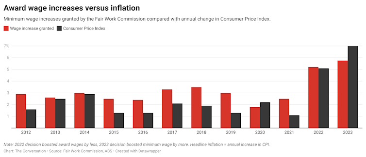 It’s true the decision to increase the federal minimum wage by 8.6% was for more than the increase in award rates. That’s because the minimum wage serves a different purpose to awards. It targets low-wage people who aren’t covered by awards, which is a tiny 0.7% of workers.