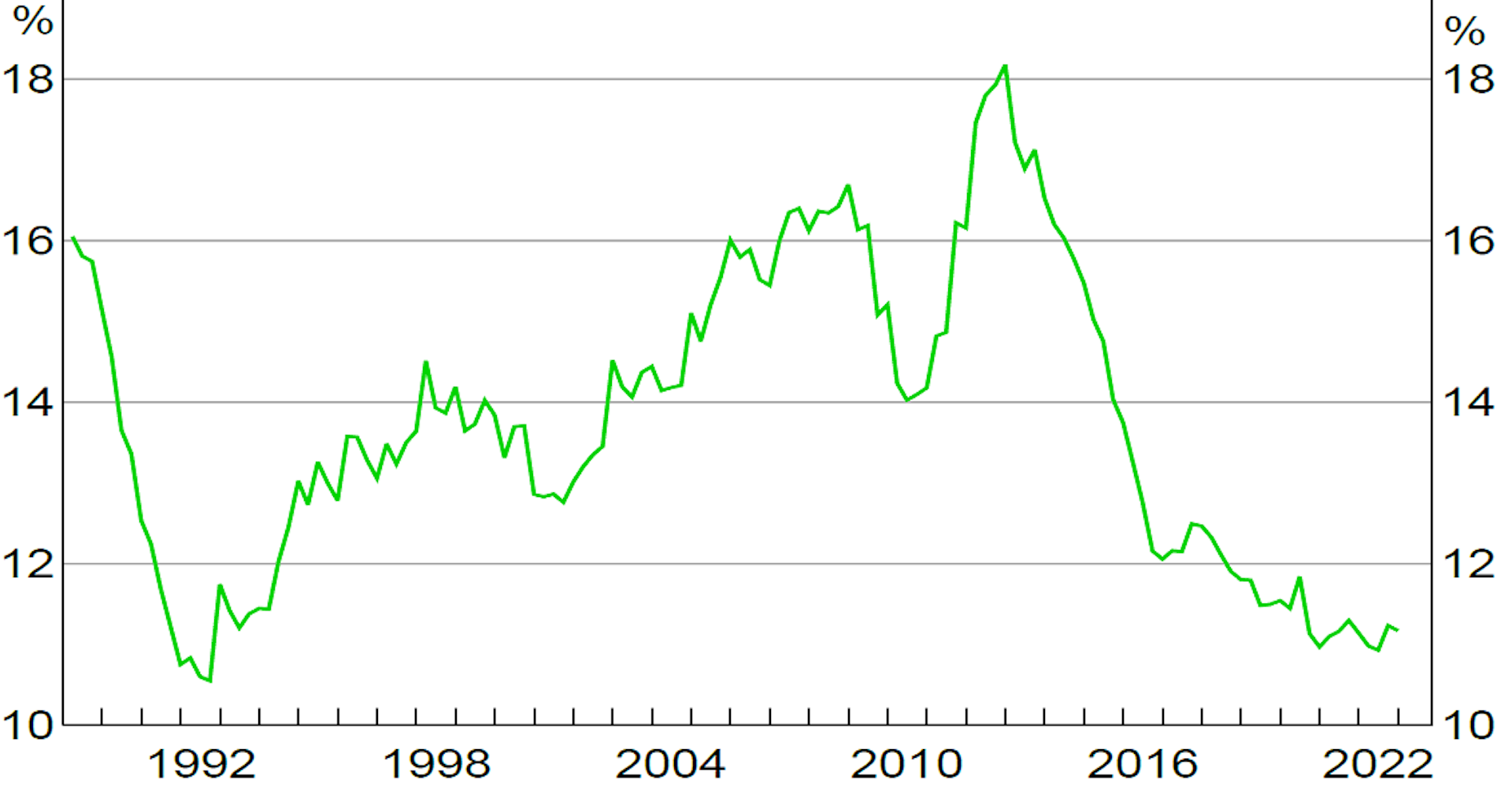 In previous decades labour productivity growth has averaged 2.4% and 2.2%, and most recently 1.1%, allowing wages growth of at least one percentage point above the Reserve Bank’s inflation target without accelerating inflation.