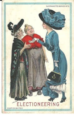 This 1909 Dunston Weiler Lithograph Co. anti-suffrage postcard offers resonances of Mrs Banks and her household staff in Mary Poppins.