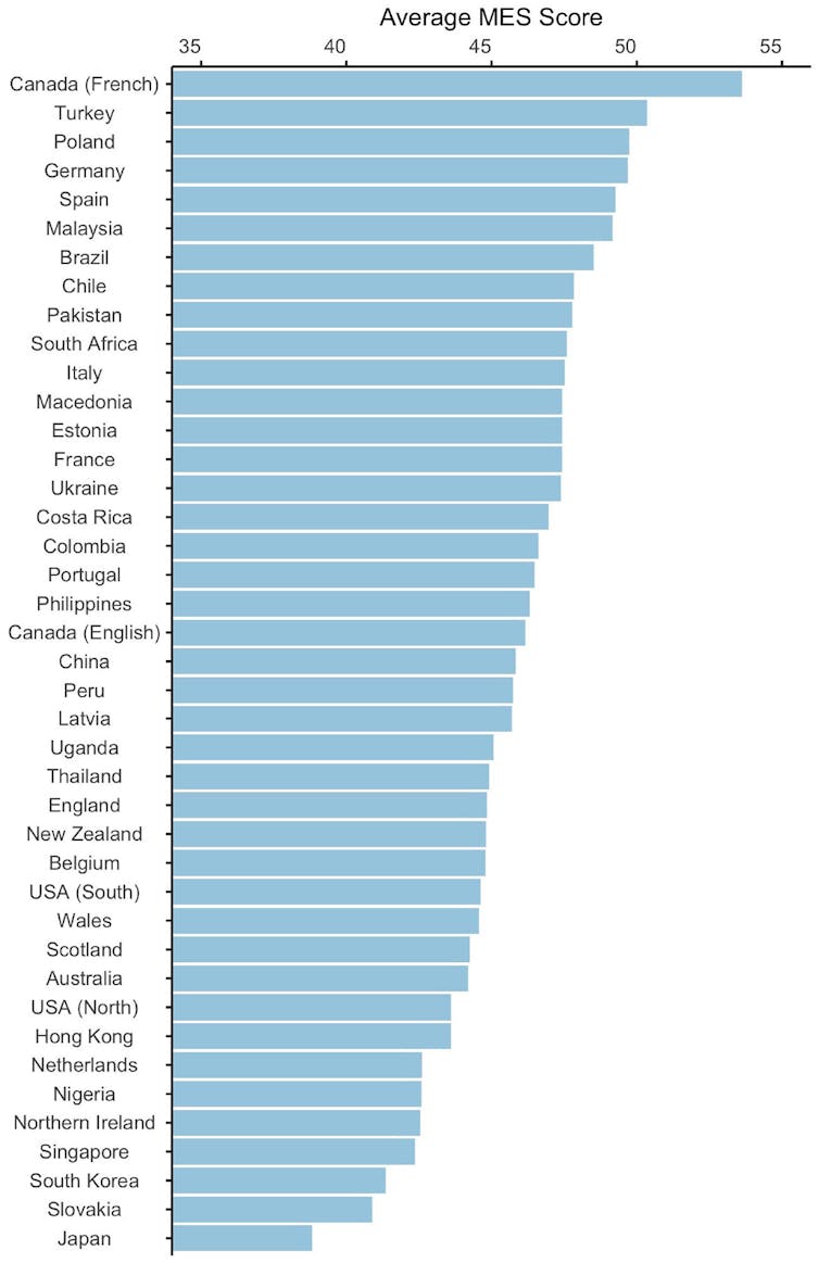 Average moral expansiveness scale (MES) scores per country. Higher numbers indicate greater moral expansiveness.