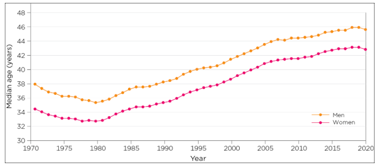 Those who divorce are doing so later in life, often after their children grow up. The median age of divorce increased from 45.9 in 2021 to 46.7 in 2022 for men and from 43.0 to 43.7 for women.