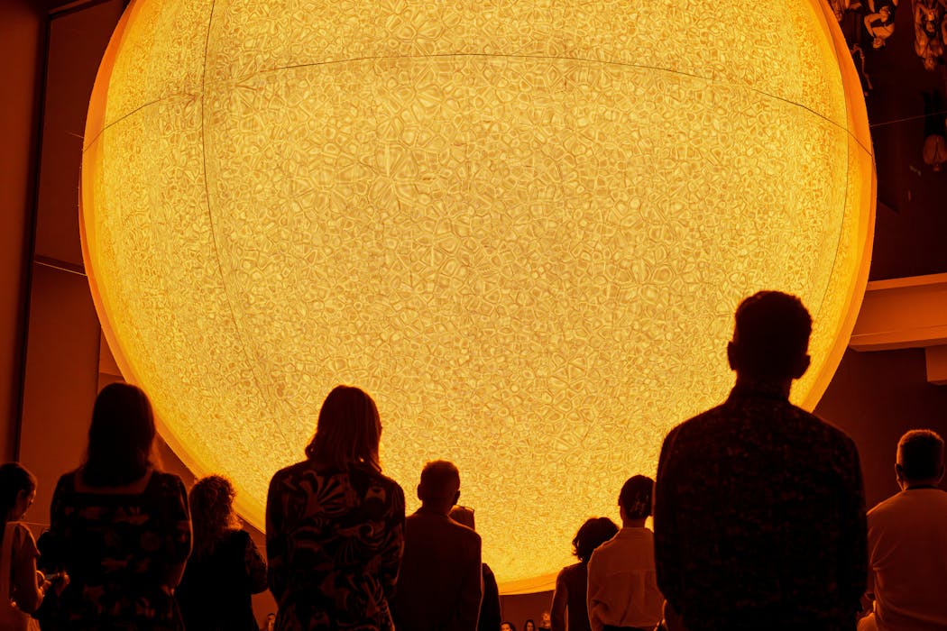 An enormous sun looms overhead in the gallery space. Somehow, it throbs and pulses with lights that render its surface active and alive. An austere rocky landscape inside another gallery reveals a riverbed and a narrow stream runs down the gentle slope towards the viewer.