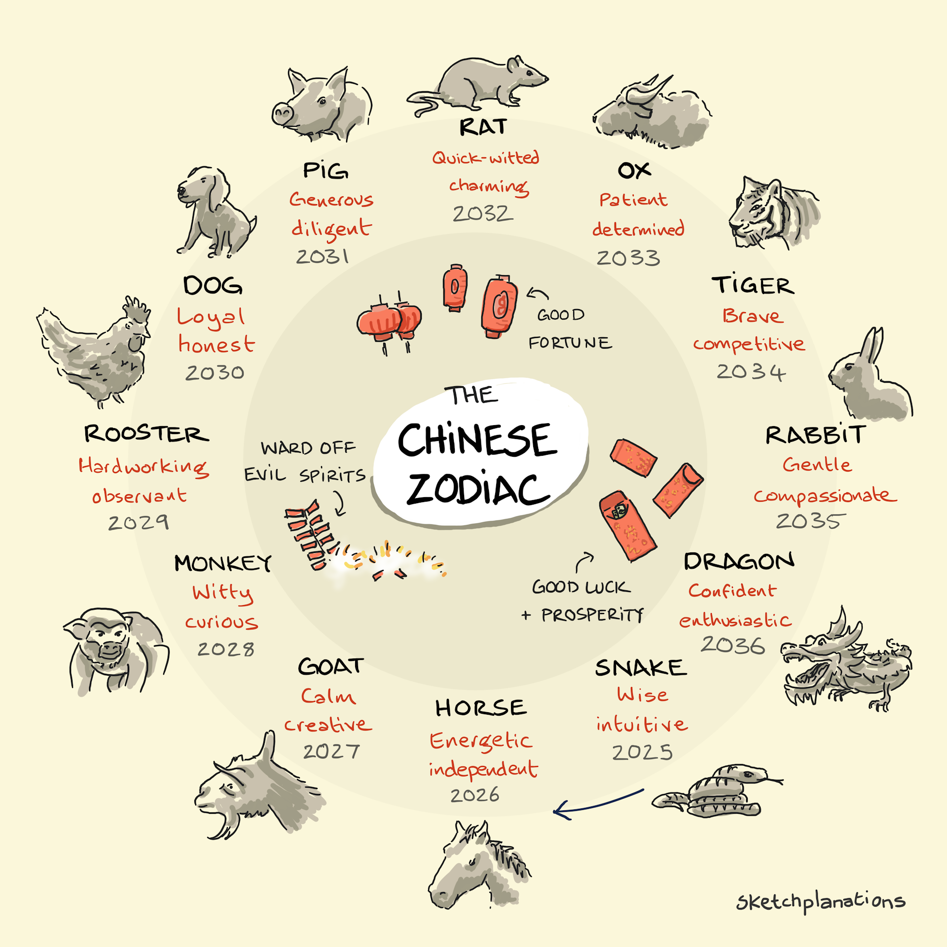 The Chinese zodiac, or shēngxiào (生肖), assigns each birth year an animal in a 12-year cycle. Someone born in the lunar year of 2025 is a snake, a symbol associated with wisdom, prosperity and clear-sightedness.