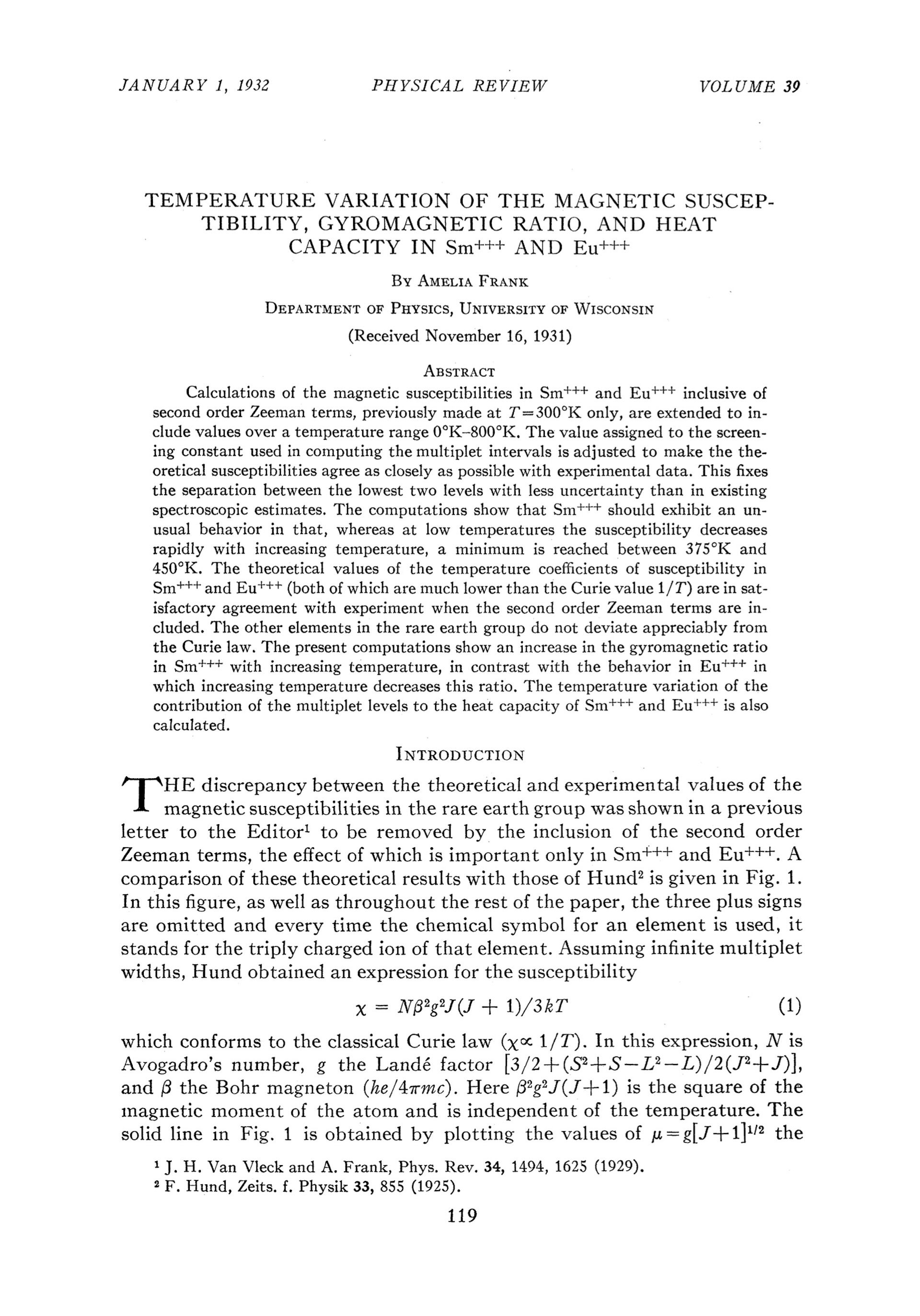 Frank’s thesis, partially published in Physical Review in 1932, focused on the element samarium. It showed quantum mechanical corrections were needed to explain the experimental data and contains a plot that appears in Van Vleck’s Nobel lecture, labelled “V.V. & F”.