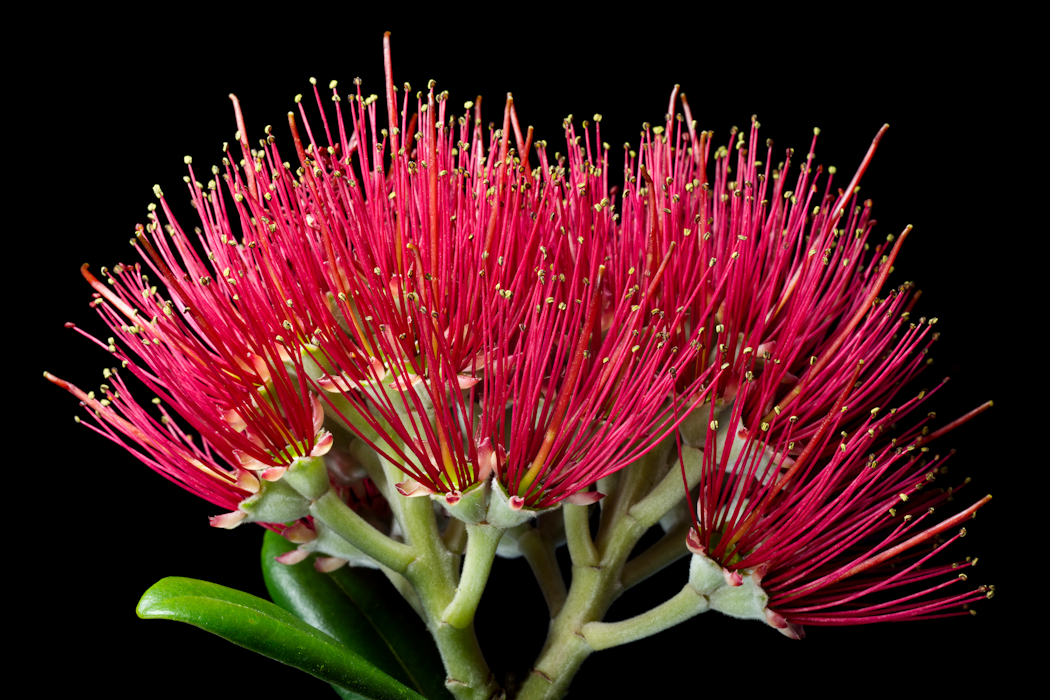 We know more about the flower biology of pōhutukawa than many other native trees. Each flower in a pom-pom cluster has a ring of long red stamens that present pollen on yellow anthers. A little later, the central style elongates, placing its small stigma beyond the anthers. The timing difference makes self-pollination less likely.