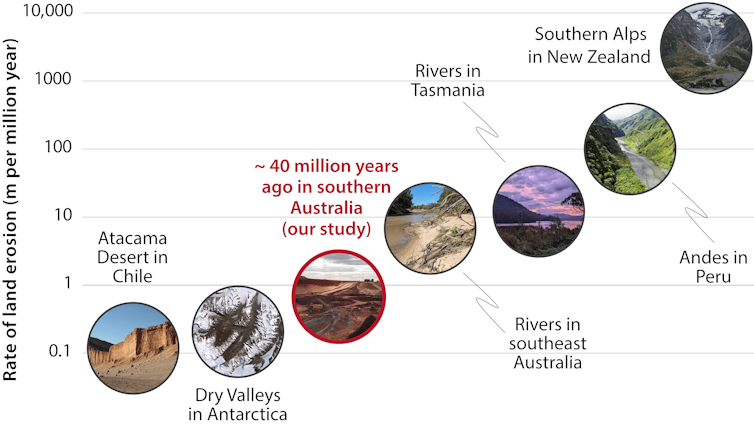The results show that around 40 million years ago, when Australia was warm, wet and covered by lush forests, landscapes in southern Australia were eroding extremely slowly – less than one metre per million years.