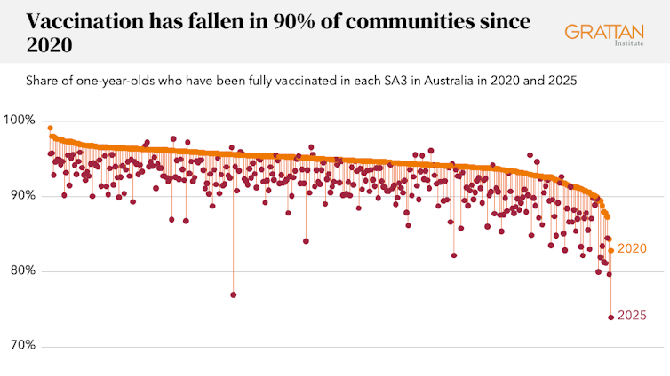 But Australia’s vaccine success is quickly slipping away. After the pandemic, the share of one-year-olds who are fully vaccinated kept falling. In some areas, it’s now barely 80%.