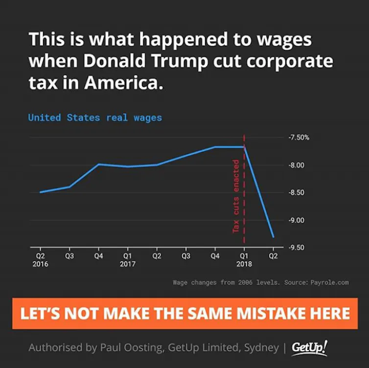 A social media post shared by lobby group GetUp! Australia argued against the tax cuts, suggesting that US real wages fell after the Trump administration cut corporate tax rates from 35% to 21%.