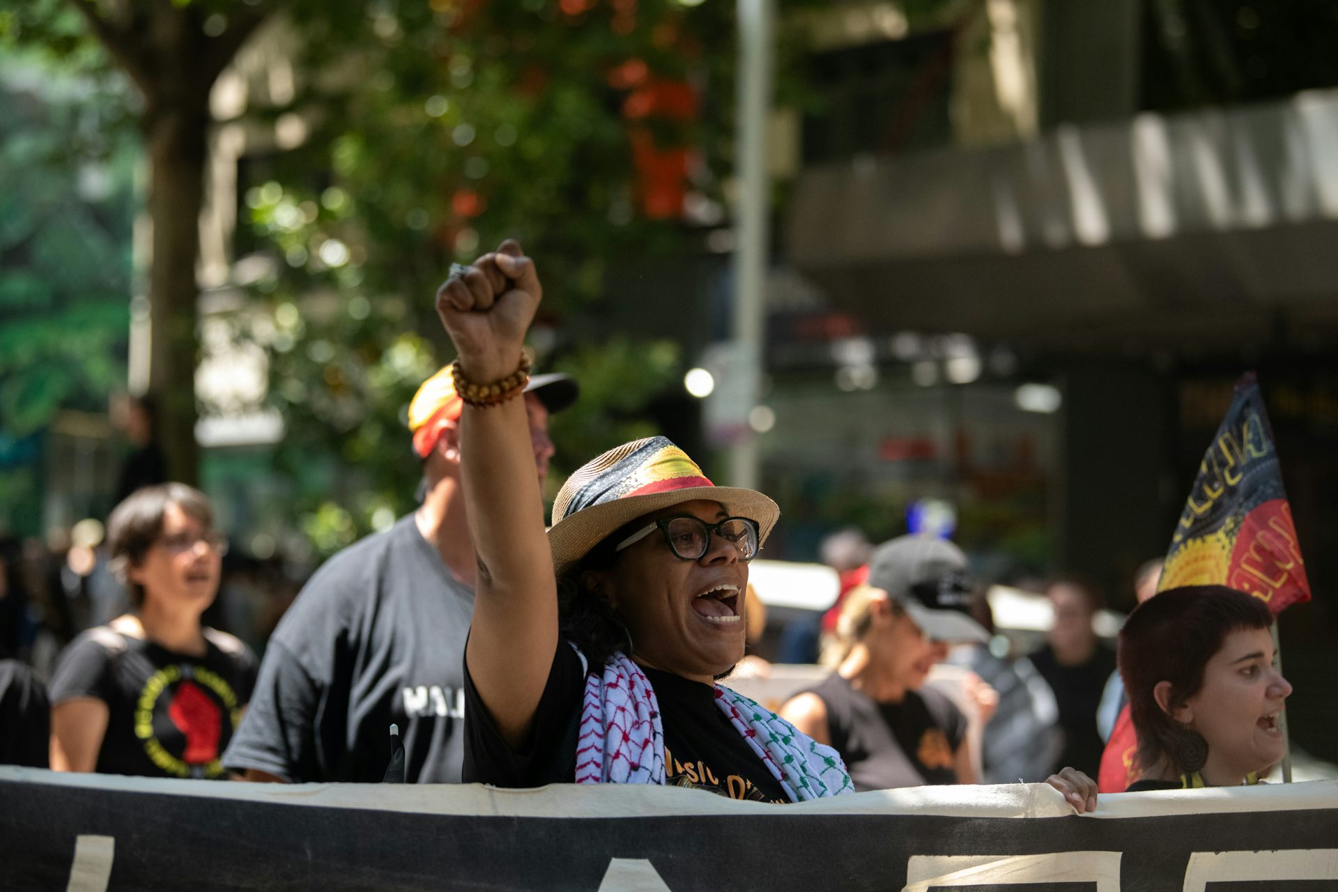 An Indigenous woman marching with one fist in the air
