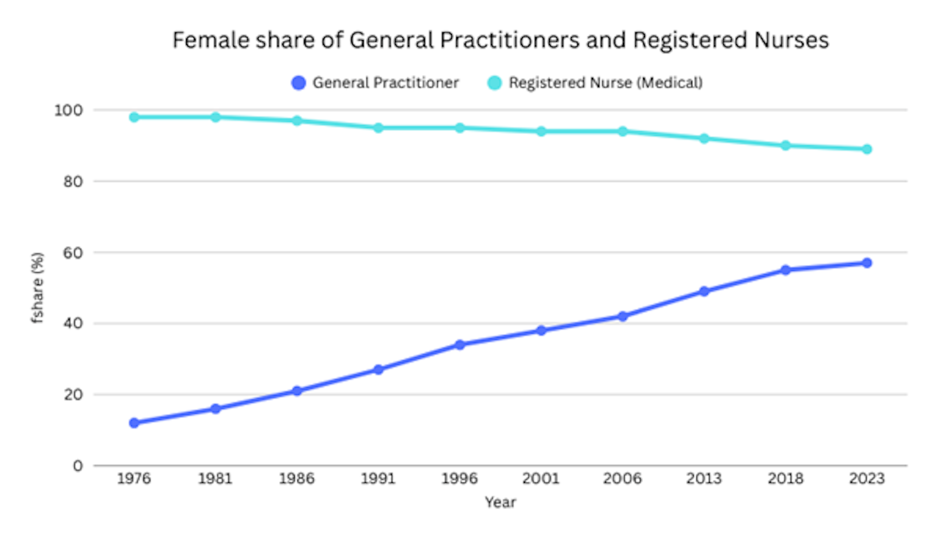The share of female doctors has risen sharply, from just 12% of GPs in 1976 to 57% in 2023. The reverse shift has been far weaker: men have moved into nursing only marginally and the occupation remains overwhelmingly female, with 89% of registered nurses women in 2023.