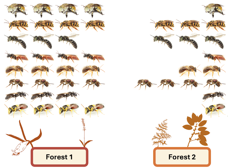 Imagine that you go and sample two forests for bees. In the first, you find eight species, all in similarly high abundance. In the second, you also catch eight species – but while some are in high abundance, you also find some only a handful of times.